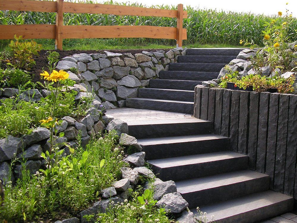 Wir erstellen Außentreppen für die verschiedensten Zwecke - sei es eine einfache Gartentreppe, ein funktionaler Auf- oder Abgang zu einem Nebeneingang oder eine anspruchsvolle Treppenanlage zum Hauseingang. Als Materialien für Außentreppen kommen Beton- oder Natursteinvollblockstufen oder (wegen des geringeren Gewichts) Betonhohlblockstufen in Frage. Als Randbefestigung werden in der Regel Beton- oder Natursteinpalisaden, aber auch Beton-Trockenmauersteine oder Natur-Bruchsteine verwendet. Gerne beraten wir Sie, wie sich Ihr Außentreppen-Projekt realisieren lässt.