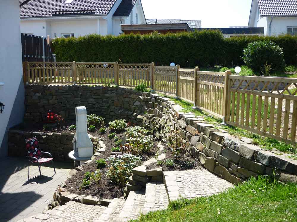Auf den vielfach schrägen Grundstücken des Sauerlands besteht häufig die Notwendigkeit, eine Böschungs- oder Stützmauer zu errichten. Eine zeitgemäße Form hierfür ist die Trockenmauer. Sie kann aus Natur- oder Betonsteinen erstellt werden und benötigt keine Mörtelfugen, was die Erstellungszeit verringert. Bei den Betonsteinen existiert durch immer neue Ideen der Hersteller mittlerweile eine große Angebotsvielfalt. Doch ist nicht jeder Stein für jeden Zweck geeignet. Gerne beraten wir Sie, welche Steinvariante bei Ihnen am sinnvollsten erscheint.